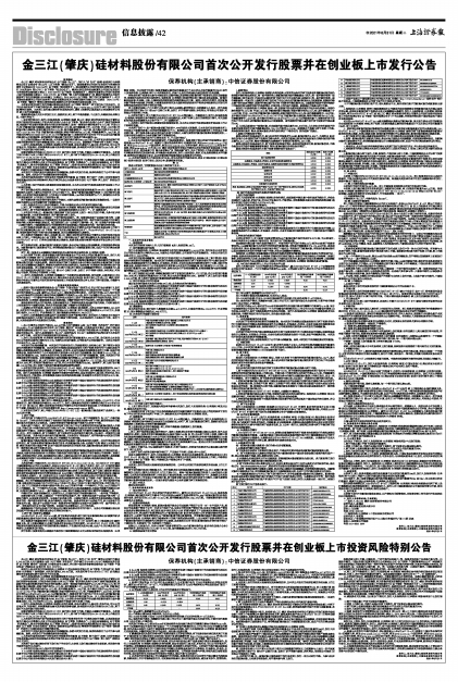 11、发行人和保荐机构(主承销商)郑重提示广大投资者注意投资风险,理性投资,认真阅读2021年8月31日(T-1日)刊登在《中国证券报》《上海证券报》《证券时报》及《证券日报》上的《金三江(肇庆)硅材料股份有限公司首次公开发行股票并在创业板上市投资风险特别公告》,充分了解市场风险,审慎参与本次新股发行。