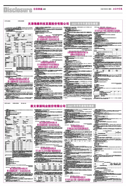 具体内容详见公司同日披露在上海证券交易所网站(www.sse.com.cn)及指定媒体的《天津海泰科技发展股份有限公司2021 年半年度报告》《天津海泰科技发展股份有限公司2021 年半年度报告摘要》。