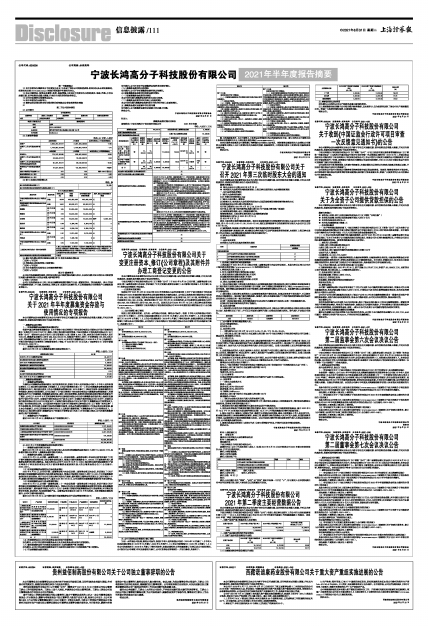 具体内容详见公司同日在上海证券交易所网站(www.sse.com.cn)披露的《宁波长鸿高分子科技股份有限公司2021年半年度报告》及《宁波长鸿高分子科技股份有限公司2021年半年度报告摘要》。