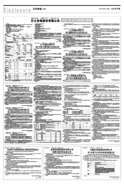 巴士在线股份有限公司(以下简称“公司”)第五届监事会第九次会议于2021年8月25日以电话和邮件的方式发出会议通知,会议于2021年8月30日以现场和通讯相结合的方式召开。会议应参加表决的监事5人,实际参加表决的监事5人。本次会议的召开与表决程序符合《公司法》、《公司章程》及《监事会议事规则》的有关规定。