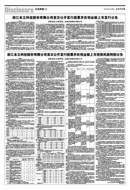 浙江本立科技股份有限公司首次公开发行股票并在创业板上市投资风险特别公告