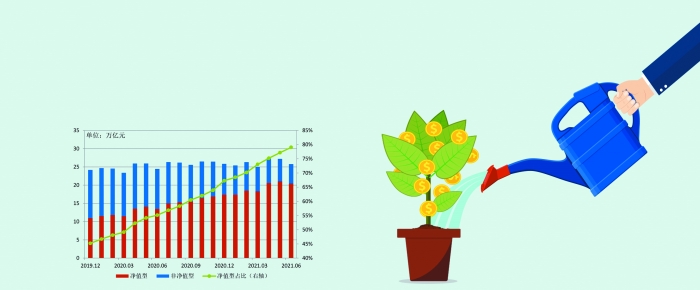 事实上,在资管新规与理财新规确定的监管格局下,非净值型理财产品已在加速退场。银行业理财登记托管中心8月13日发布的《中国银行业理财市场半年报告(2021年上)》(下称《理财半年报》)显示,截至6月底,理财产品存续规模达25.80万亿元,同比增长5.37%,其中净值型理财产品存续规模20.39万亿元,较年初增长17.18%,同比增长51.06%,占全部理财产品存续余额的比例接近八成。