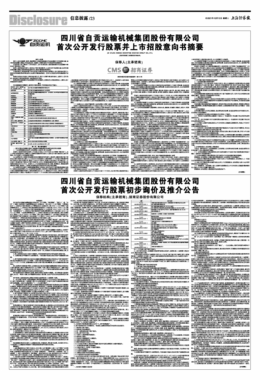 17、本公告仅对本次发行中有关初步询价事宜进行说明。投资者欲了解本次发行的详细情况,请仔细阅读2021年10月12日(T-6日)登载巨潮资讯网(http://www.cninfo.com.cn)的《四川省自贡运输机械集团股份有限公司首次公开发行股票招股意向书》(以下简称“招股意向书”)全文。《四川省自贡运输机械集团股份有限公司首次公开发行股票招股意向书摘要》同日刊登于《中国证券报》、《上海证券报》、《证券时报》和《证券日报》。