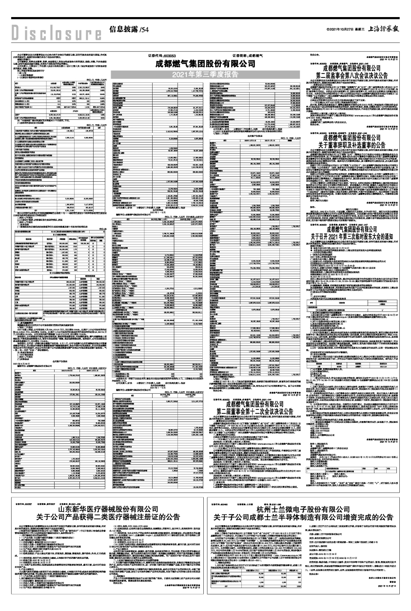 具体内容详见同日刊载于上海证券交易所网站(www.sse.com.cn)的《成都燃气集团股份有限公司2021年第三季度报告》。