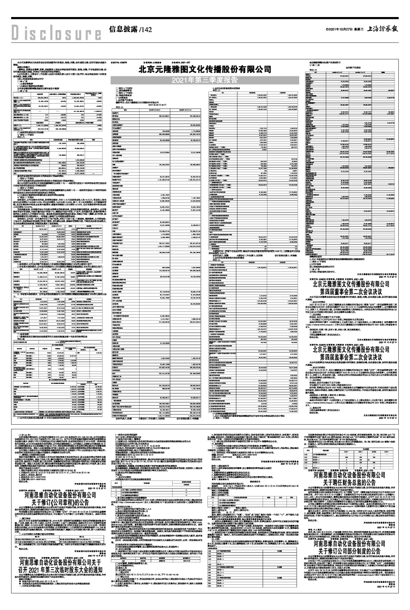 具体内容详见刊载于《证券时报》、《证券日报》、《中国证券报》、《上海证券报》及巨潮资讯网(http://www.cninfo.com.cn)上的《北京元隆雅图文化传播股份有限公司2021年第三季度报告全文》。