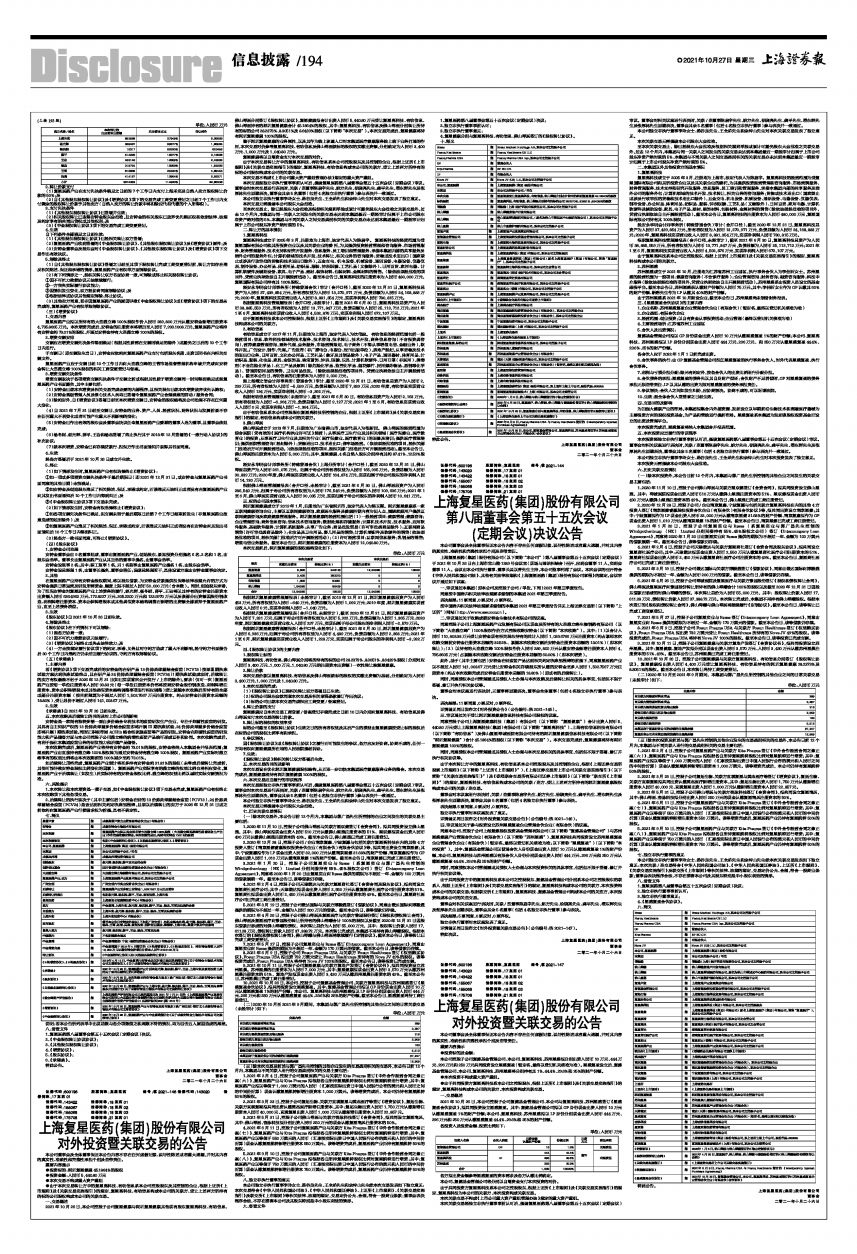 9、2021年10月11日,控股子公司复星健康与关联方复地产发签订《合资协议书》,拟共同投资设立苏州星晨。其中:复星健康、复地产发拟分别以现金出资人民币3,570万元、人民币3,430万元认缴苏州星晨注册资本的51%、49%。截至本公告日,苏州星晨已完成工商注册登记。