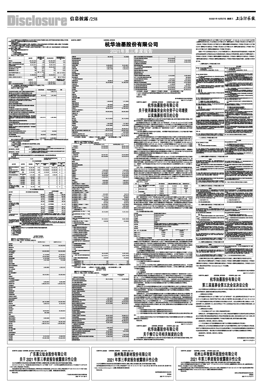 杭州山科智能科技股份有限公司(以下简称“公司”)于2021年10月25日召开第三届董事会第三次会议、第三届监事会第三次会议,审议通过了《2021年第三季度报告》。