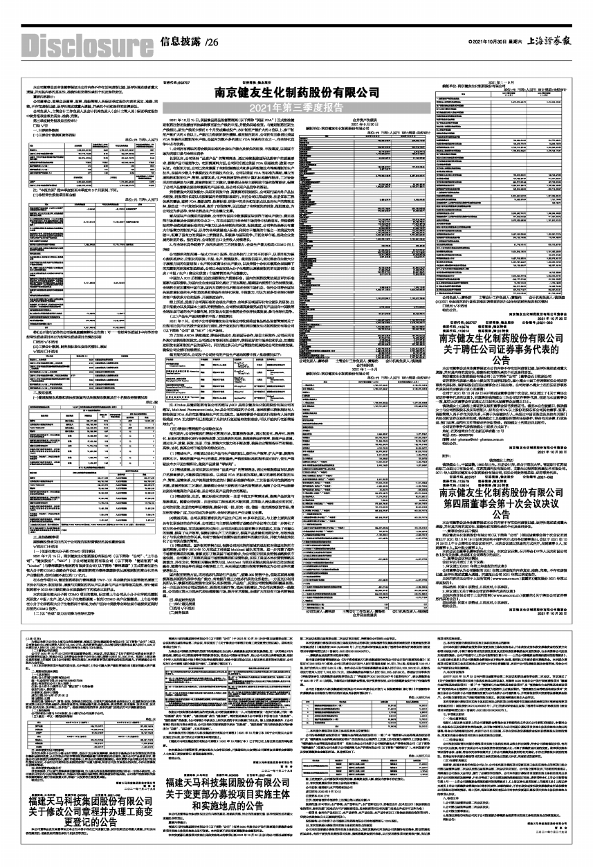 《福建天马科技集团股份有限公司章程》(2021年10月修订本)已于同日在上海证券交易所网站披露。