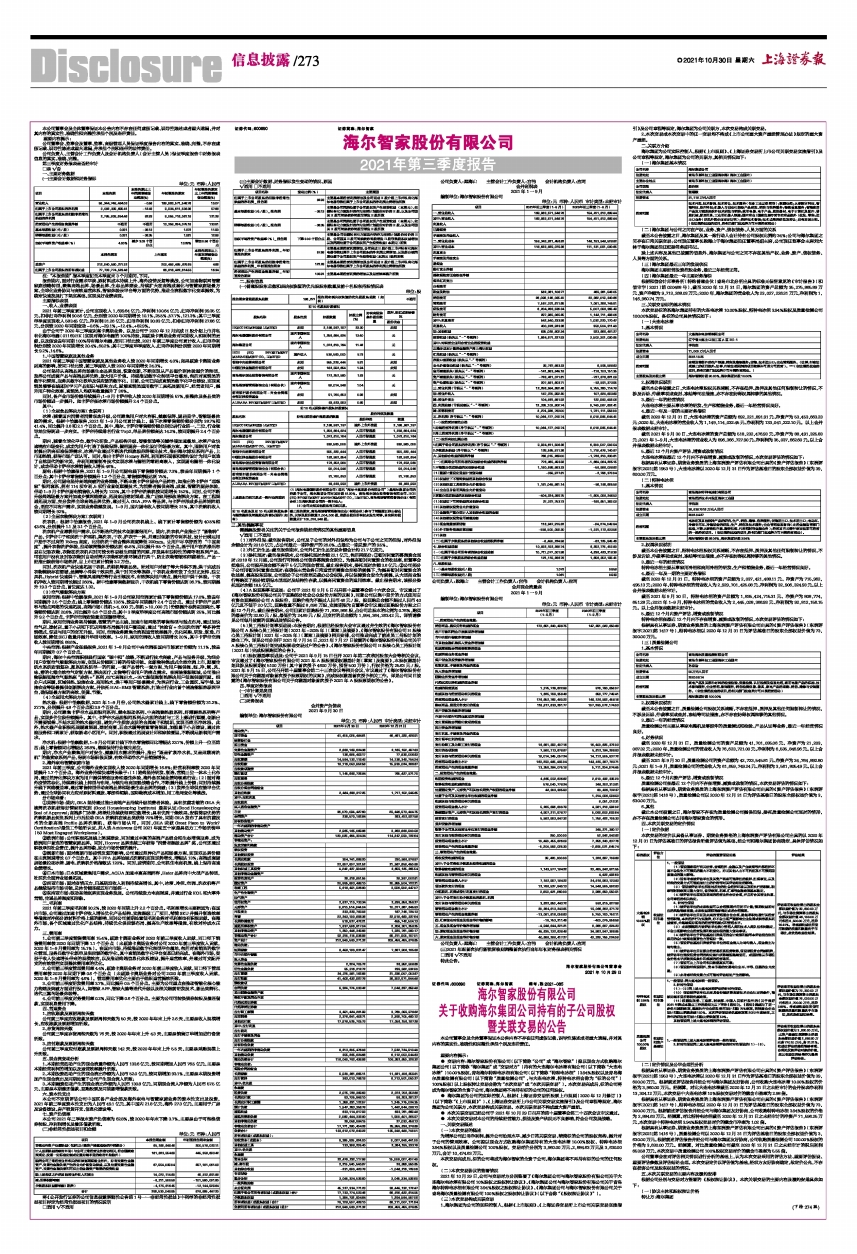 由于公司于2020年三季度剥离卡奥斯业务,以及公司于2020年12月完成H股介绍上市并私有化海尔电器(01169.HK)实现对海尔电器的100%持股,如剔除卡奥斯业务对同期收入和利润的贡献,以及假设去年同期100%持有海尔电器,按同口径比较,2021年前三季度公司累计收入、归母净利润分别较2020年同期增长20.4%、60.2%;其中三季度单季度收入、归母净利润分别较2020年同期增长9.2%、14.6%。