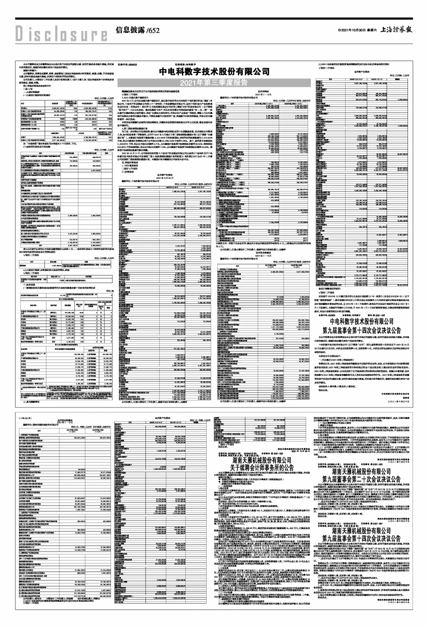 中电科数字技术股份有限公司(以下简称“公司”)第九届监事会第十四次会议于2021年10月29日以通讯方式召开。本次会议应到监事5名,实到监事5名。本次会议符合国家有关法律法规和公司章程的规定。