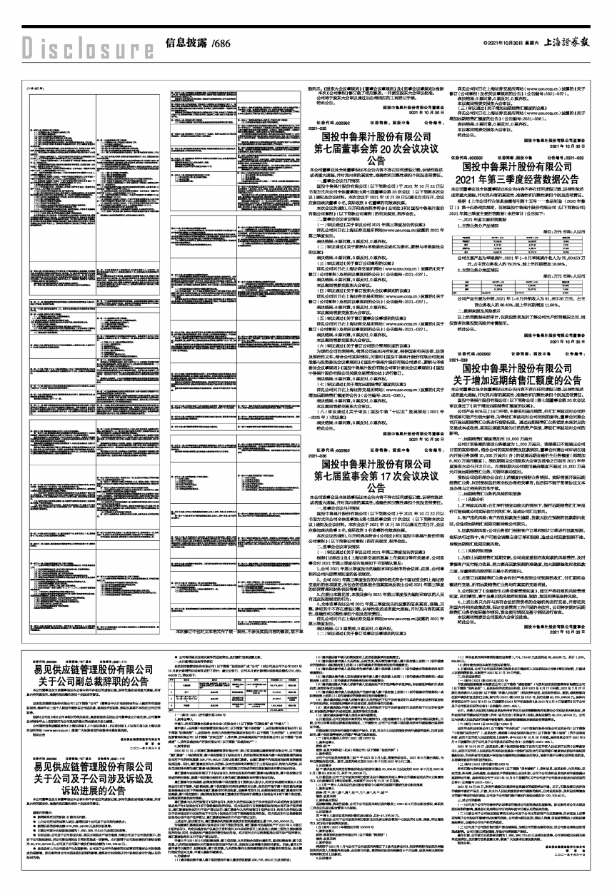 根据《上市公司行业信息披露指引第十五号一一食品制造(2020年修订)》第十四条相关规定,现将国投中鲁果汁股份有限公司(以下简称公司)2021年第三季度主要经营数据(未经审计)公告如下: