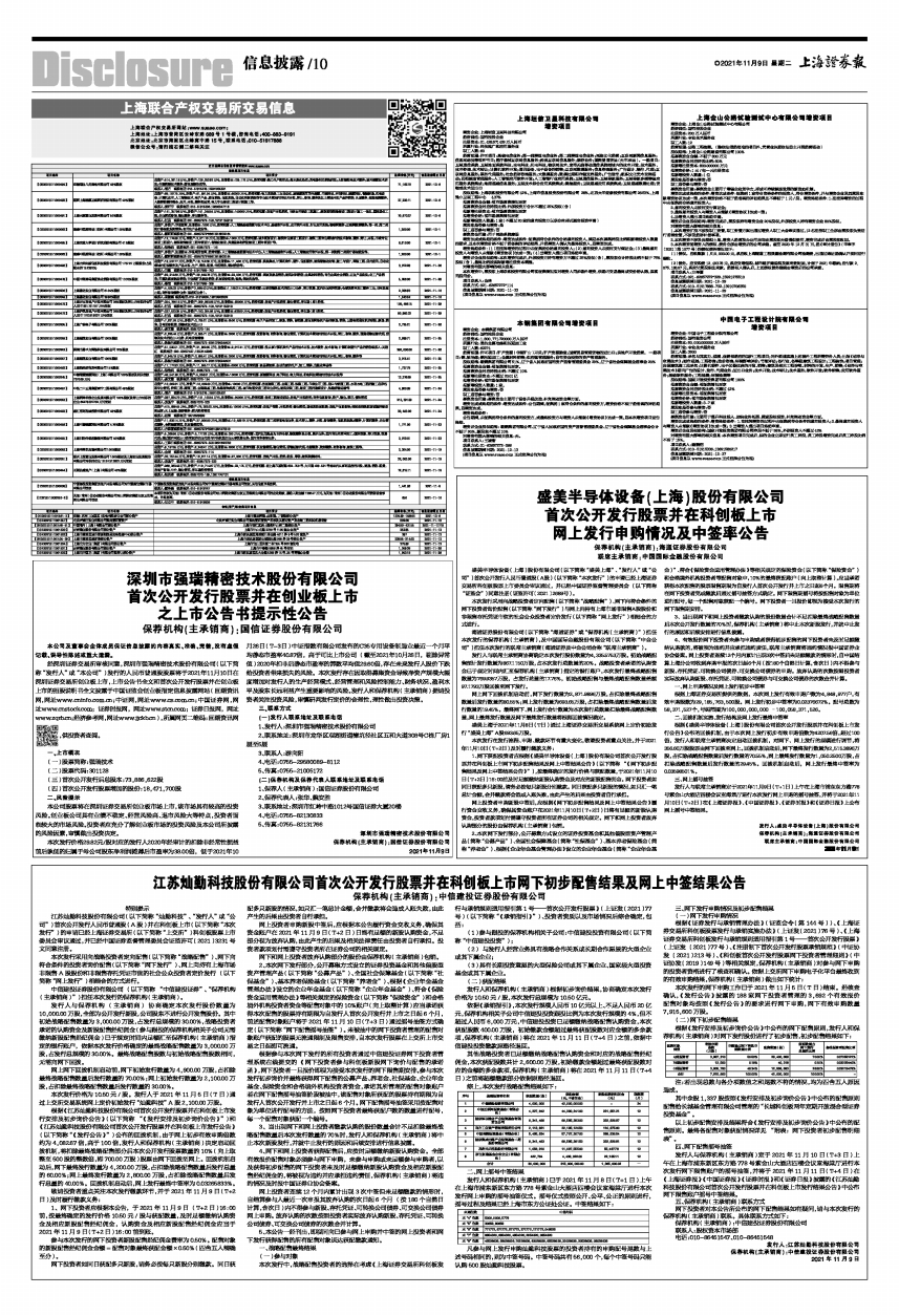 经深圳证券交易所审核同意,深圳市强瑞精密技术股份有限公司(以下简称“发行人”或“本公司”)发行的人民币普通股股票将于2021年11月10日在深圳证券交易所创业板上市,上市公告书全文和首次公开发行股票并在创业板上市的招股说明书全文披露于中国证监会创业板指定信息披露网站(巨潮资讯网,网址www.cninfo.com.cn;中证网,网址www.cs.com.cn;中国证券网,网址www.cnstock.com;证券时报网,网址www.stcn.com;证券日报网,网址www.zqrb.cn;经济参考网,网址www.jjckb.cn),所属网页二维码:巨潮资讯网■,供投资者查阅。