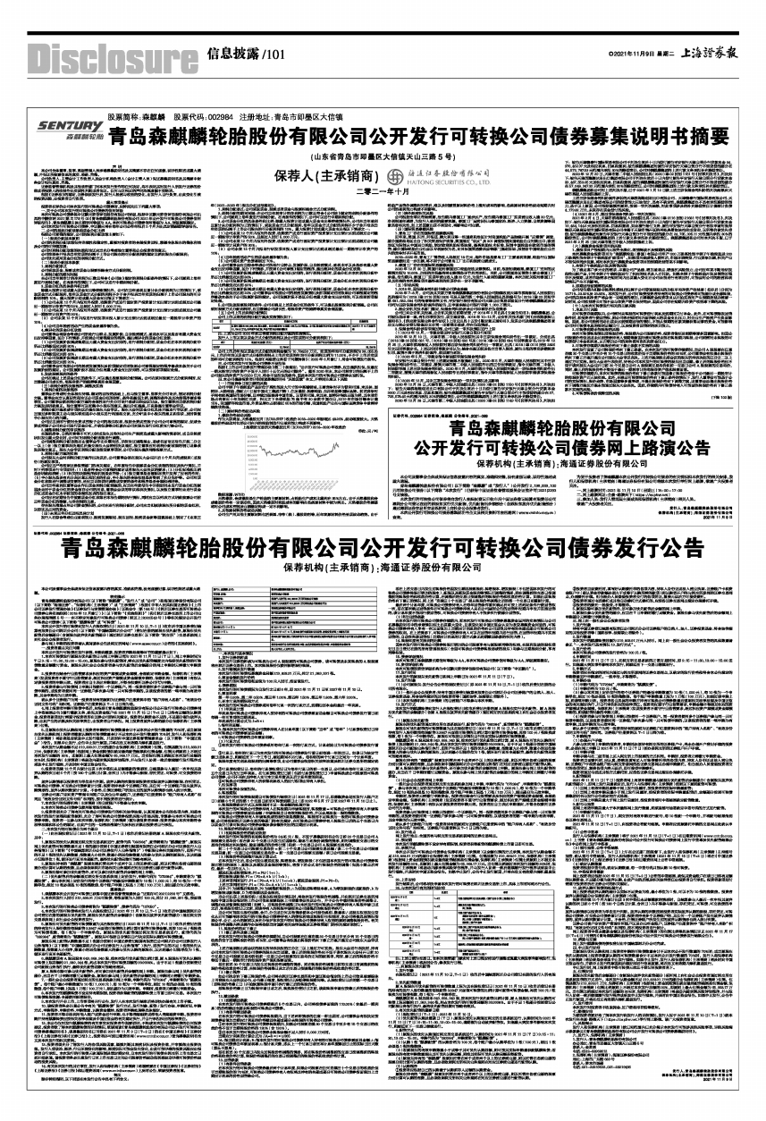 为便于投资者了解森麒麟本次公开发行可转换公司债券的有关情况和本次发行的相关安排,发行人和保荐机构(主承销商)海通证券股份有限公司将就本次发行举行网上路演,敬请广大投资者关注。