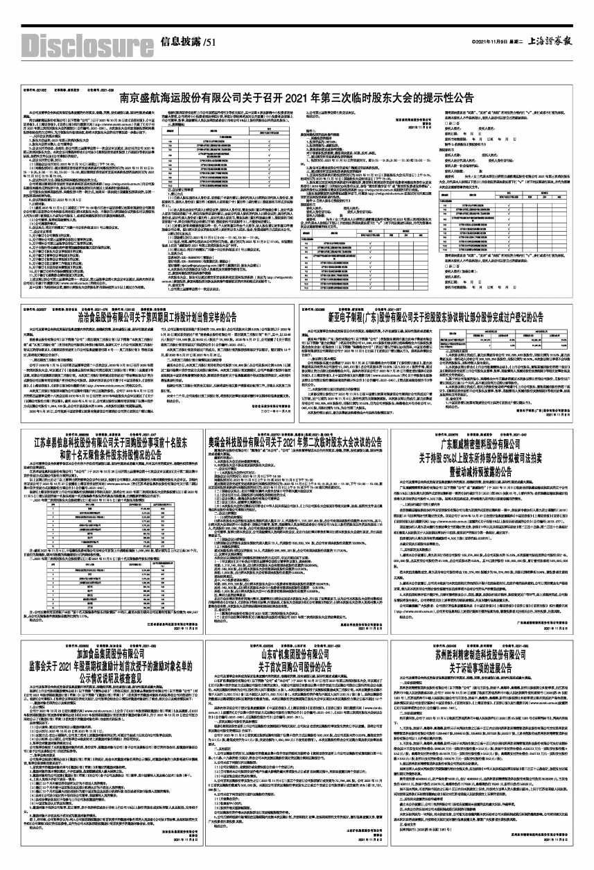 (2)信函、传真、邮件以抵达本公司的时间为准。截止时间为2021年11月9日17:00。来信请在信函上注明“盛航股份2021年第三次临时股东大会”字样。