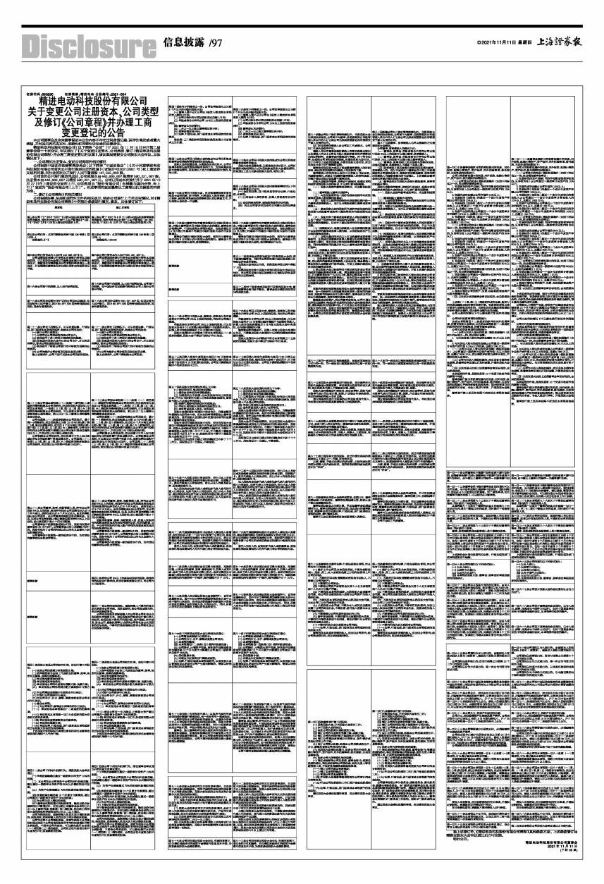 精进电动科技股份有限公司(以下简称“公司”)于2021年11 月10日召开第二届董事会第十七次会议,审议通过了《关于变更注册资本、公司类型、修订〈精进电动科技股份有限公司章程〉并办理工商变更登记的议案》,该议案尚需提交公司股东大会审议。具体情况如下: