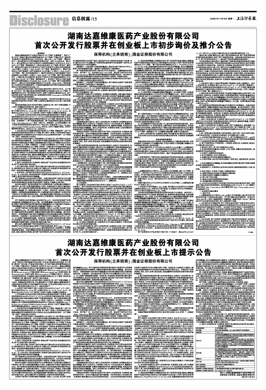 8、提示投资者注意投资风险:初步询价结束后,如发行人和保荐机构(主承销商)确定的发行价格超过《发行公告》中披露的网下投资者剔除最高报价部分后剩余报价的中位数和加权平均数以及剔除最高报价后公募基金、社保基金、养老金、企业年金基金和保险资金报价中位数和加权平均数的孰低值,或本次发行定价对应市盈率高于同行业可比上市公司二级市场平均市盈率(中证指数有限公司发布的同行业最近一个月静态平均市盈率),发行人和保荐机构(主承销商)将在网上申购前发布《湖南达嘉维康医药产业股份有限公司首次公开发行股票并在创业板上市投资风险特别公告》(以下简称“《投资风险特别公告》”),详细说明定价合理性,提示投资者注意投资风险。