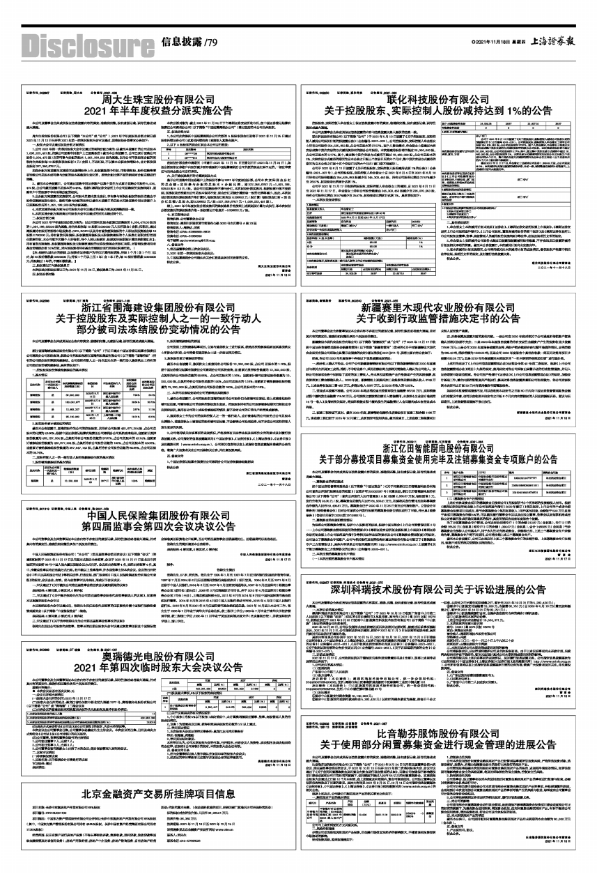周大生珠宝股份有限公司(以下简称“本公司”或“公司”),2021年半年度权益分派方案已获2021年11月12日召开的2021年第一次临时股东大会审议通过,现将权益分派事宜公告如下: