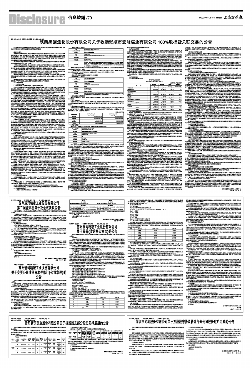 ●为稳定公司炼焦煤供应,陕西黑猫焦化股份有限公司(简称 公司)以现金4,856.01万元收购陕西黄河矿业(集团)有限责任公司(简称 黄河矿业)所持张掖市宏能煤业有限公司(简称 宏能煤业或收购标的)100%股权(简称 本次交易)。根据约定,2023年底前,宏能煤业需偿还前期为项目建设向黄河矿业所借款项,截止2021年9月30日所借款项本息合计189,462.81万元(已经审计)。上述借款偿还所需资金由宏能煤业以自有及自筹资金偿还。