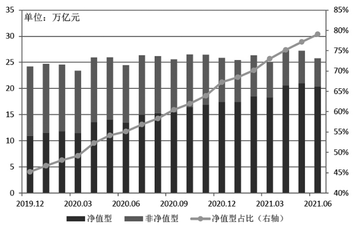 权益类理财产品规模虽较2020年末增加,但从今年中期数据看,占比仍然非常低。据中国理财网统计,截至6月底,权益类理财产品存续余额为843亿元,占产品总规模的0.33%;理财投向权益类资产余额为1.17万亿元,占总投资资产的4.08%;理财投向债券类、非标准化债权类资产余额分别为19.29万亿元、3.75万亿元,分别占总投资资产的67.31%、13.08%。