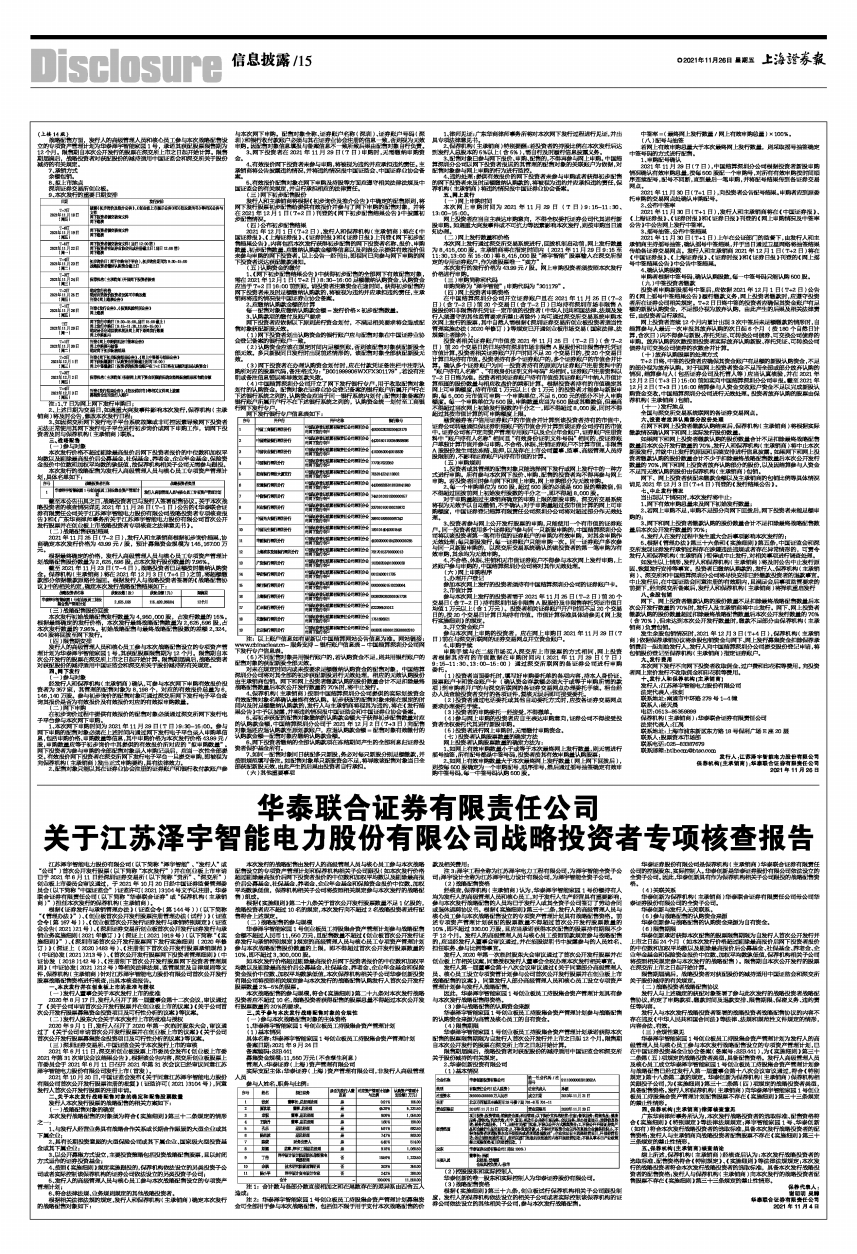 根据《证券发行与承销管理办法》(证监会令〔第144号〕)(以下简称“《管理办法》”)、《创业板首次公开发行股票注册管理办法(试行)》(证监会令〔第167号〕)、《创业板首次公开发行证券发行与承销特别规定》(证监会公告〔2021〕21号)、《深圳证券交易所创业板首次公开发行证券发行与承销业务实施细则(2021年修订)》(深证上〔2021〕919号)(以下简称“《实施细则》”)、《深圳市场首次公开发行股票网下发行实施细则(2020年修订)》(深证上〔2020〕483号)、《注册制下首次公开发行股票承销规范》(中证协发〔2021〕213号)、《首次公开发行股票网下投资者管理细则》(中证协发〔2018〕142号)、《注册制下首次公开发行股票网下投资者管理规则》(中证协发〔2021〕212号)等相关法律法规、监管规定及自律规则等文件,保荐机构(主承销商)针对江苏泽宇智能电力股份有限公司首次公开发行股票战略配售资格进行核查,出具本核查报告。