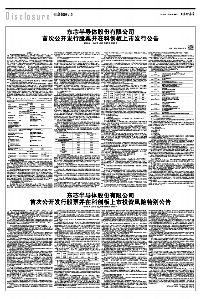 19、拟参与本次发行申购的投资者,须认真阅读2021年11月23日(T-6日)刊登在上交所(www.sse.com.cn)的《东芯半导体股份有限公司首次公开发行股票并在科创板上市招股意向书》全文,特别是其中的“重大事项提示”及“风险因素”章节,充分了解发行人的各项风险因素,谨慎判断其经营状况及投资价值,并审慎做出投资决策。发行人受到政治、经济、行业及经营管理水平的影响,经营状况可能会发生变化,由此可能导致的投资风险应由投资者自行承担。