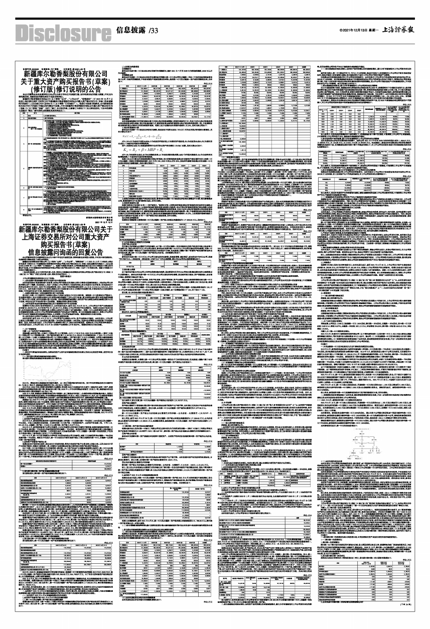 新疆库尔勒香梨股份有限公司(以下简称“公司”、“上市公司”、“香梨股份”)于2021年12月7日收到上海证券交易所下发的《关于对新疆库尔勒香梨股份有限公司重大资产购买报告书(草案)信息披露的问询函》(上证公函【2021】2958号)(以下简称“《问询函》”)。根据《问询函》的要求,公司积极组织相关各方对《问询函》中提出的问题进行回复,并对《新疆库尔勒香梨股份有限公司重大资产购买报告书(草案)》进行了补充和完善。现就《问询函》中的相关问题回复如下: