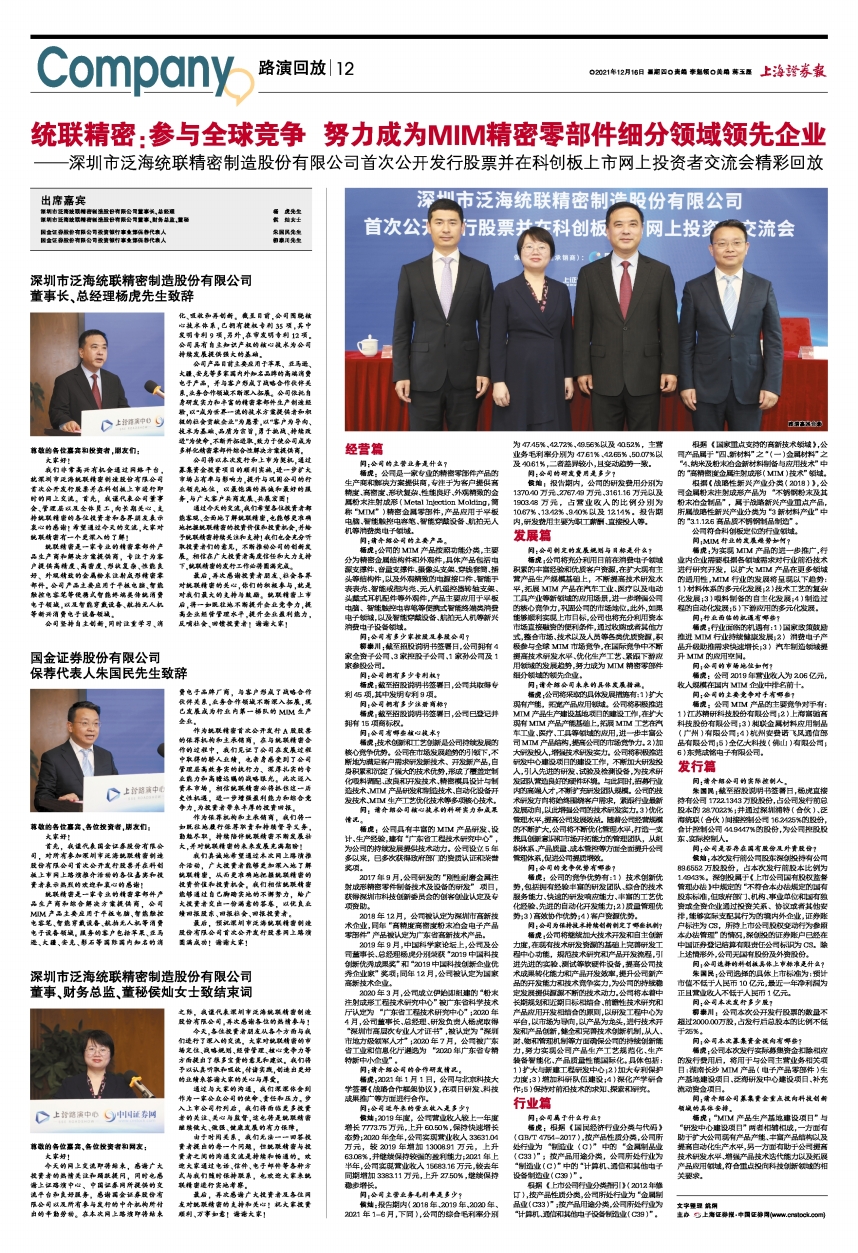 ——深圳市泛海统联精密制造股份有限公司首次公开发行股票并在科创板上市网上投资者交流会精彩回放