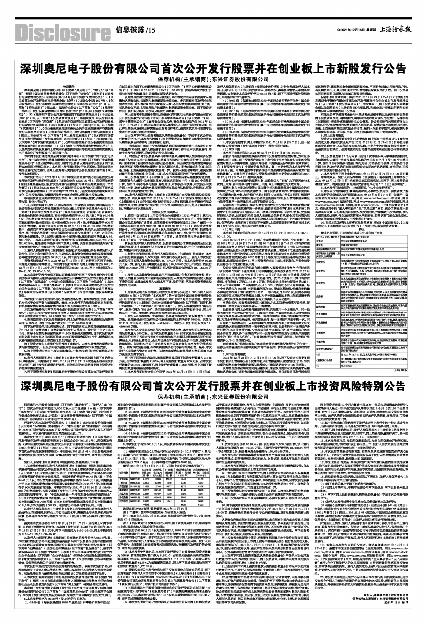 10、网下投资者应根据《深圳奥尼电子股份有限公司首次公开发行股票并在创业板上市网下初步配售结果公告》,于2021年12月21日(T+2日)16:00前,按最终确定的发行价格与初步配售数量,及时足额缴纳新股认购资金。