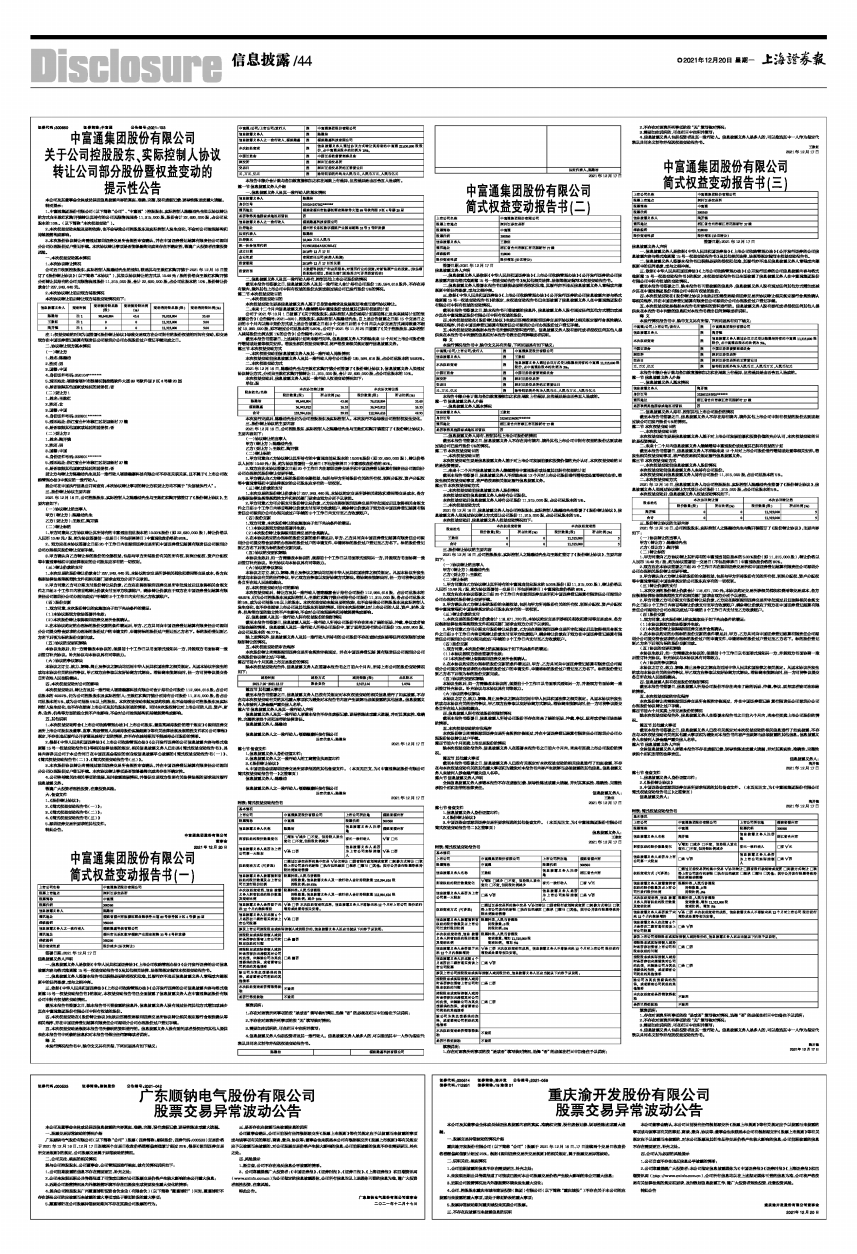 1、中富通集团股份有限公司(以下简称“公司”、“中富通”)控股股东、实际控制人陈融洁先生拟以协议转让的方式向王数红和陶开德转让其持有的公司无限售流通各11,315,000股,股份合计22,630,000股,占公司总股本的10%。(以下简称“本次权益变动”)。