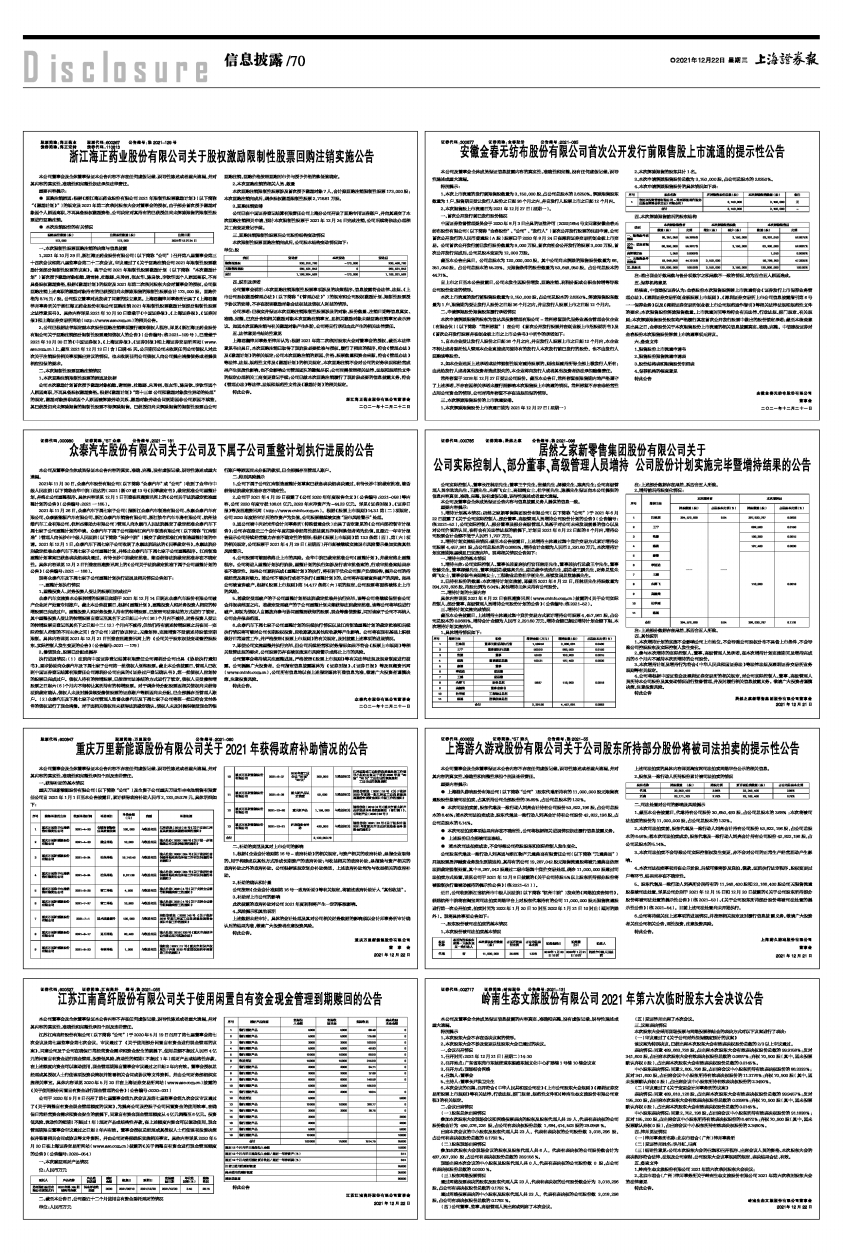 2021年11月26日,众泰汽车下属七家子公司(指浙江众泰汽车制造有限公司、永康众泰汽车有限公司、众泰新能源汽车有限公司、浙江众泰汽车销售有限公司、浙江铁牛汽车车身有限公司、杭州益维汽车工业有限公司、杭州杰能动力有限公司)管理人向永康市人民法院提交了裁定批准众泰汽车下属七家子公司重整计划的申请。众泰汽车下属子公司湖南江南汽车制造有限公司(以下简称“江南制造”)管理人向长沙市中级人民法院(以下简称“长沙中院”)提交了裁定批准江南制造重整计划的申请。2021年12月1日,众泰汽车下属七家子公司收到了永康法院送达的《民事裁定书》,永康法院分别裁定批准众泰汽车下属七家子公司重整计划,并终止众泰汽车下属七家子公司重整程序。江南制造重整计划草案已获各表决组表决通过,有待长沙中院裁定批准,能否获得法院裁定批准存在不确定性。具体内容详见12月2日刊登在巨潮资讯网上的《公司关于法院裁定批准下属子公司重整计划的公告》(公告编号:2021一166)。