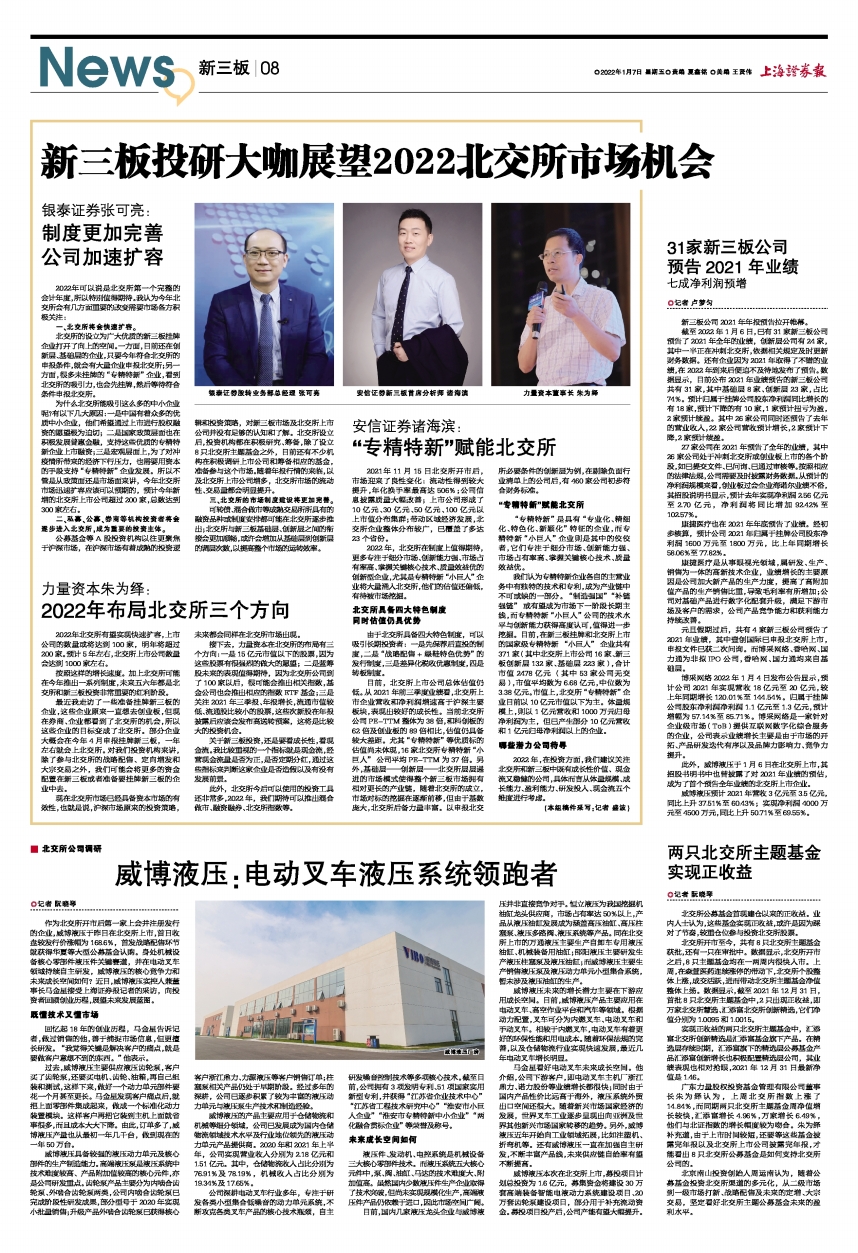作为北交所开市后第一家上会并注册发行的企业,威博液压于昨日在北交所上市,首日收盘较发行价涨幅为168.6%,首发战略配售环节就获得华夏等大型公募基金认购。身处机械设备核心零部件液压件关键赛道,并在电动叉车领域持续自主研发,威博液压的核心竞争力和未来成长空间如何?近日,威博液压实控人兼董事长马金星接受上海证券报记者的采访,向投资者回顾创业历程,展望未来发展蓝图。