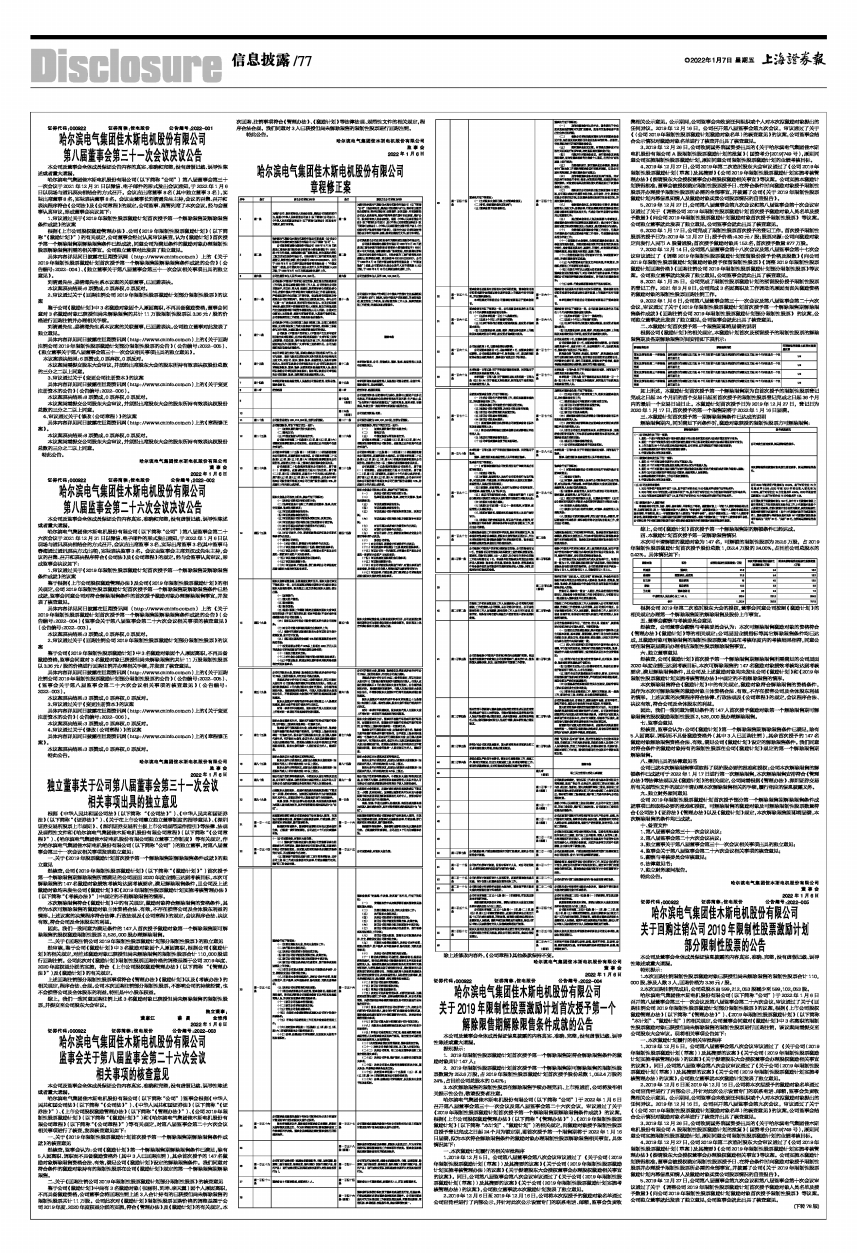 哈尔滨电气集团佳木斯电机股份有限公司(以下简称“公司”)于2022年1月6日召开第八届董事会第三十一次会议及第八届监事会第二十六次会议,审议通过了关于《回购注销公司2019年限制性股票激励计划部分限制性股票》的议案,根据《上市公司股权激励管理办法》(以下简称“《管理办法》”)、《2019年限制性股票激励计划》(以下简称“本计划”、“激励计划”)的相关规定,公司董事会同意对《激励计划》中3名离职的限制性股票激励对象已获授但尚未解除限售的限制性股票进行回购注销,该议案尚需提交至公司股东大会审议。现将相关事项公告如下: