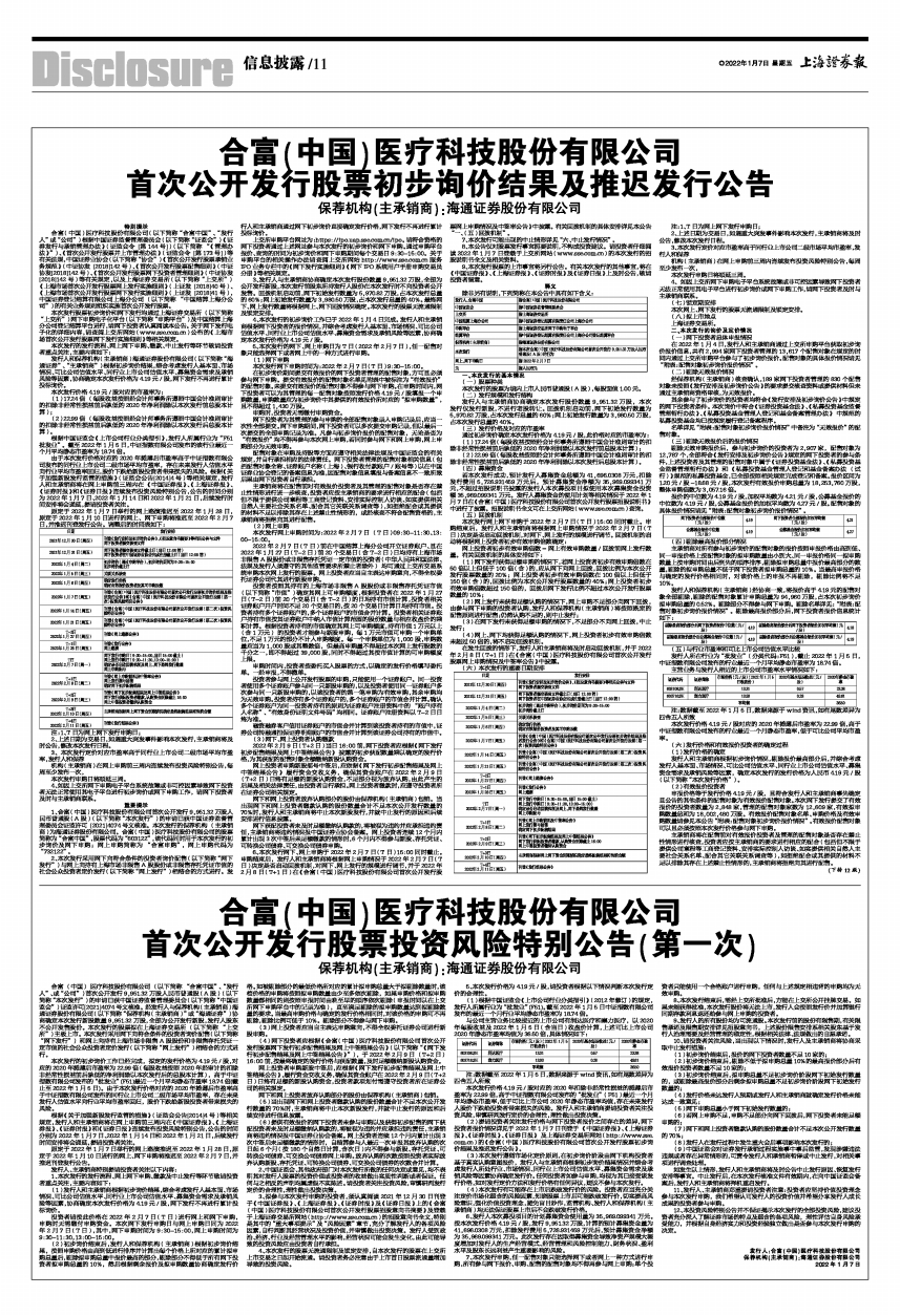 (2)提请投资者关注发行价格与网下投资者报价之间存在的差异,网下投资者报价情况详见于2022年1月7日刊登于《中国证券报》、《上海证券报》、《证券时报》、《证券日报》及上海证券交易所网站(http://www.sse.com.cn)的《合富(中国)医疗科技股份有限公司首次公开发行股票初步询价结果及推迟发行公告》。