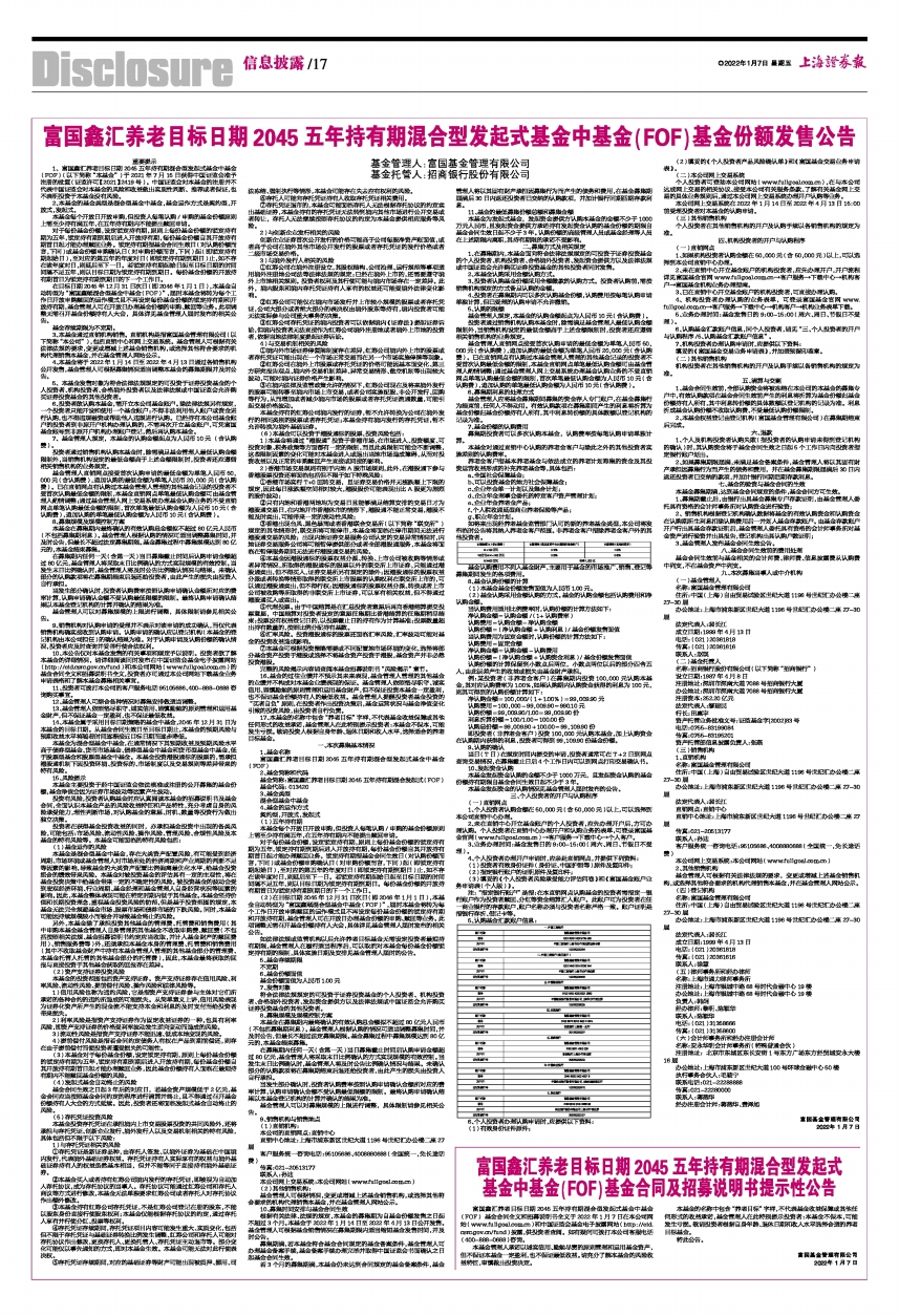富国鑫汇养老目标日期2045五年持有期混合型发起式基金中基金(FOF)基金合同全文和招募说明书全文于2022年1月7日在本公司网站(www.fullgoal.com.cn)和中国证监会基金电子披露网站(http://eid.csrc.gov.cn/fund)披露,供投资者查阅。如有疑问可拨打本公司客服电话(400-888-0688)咨询。