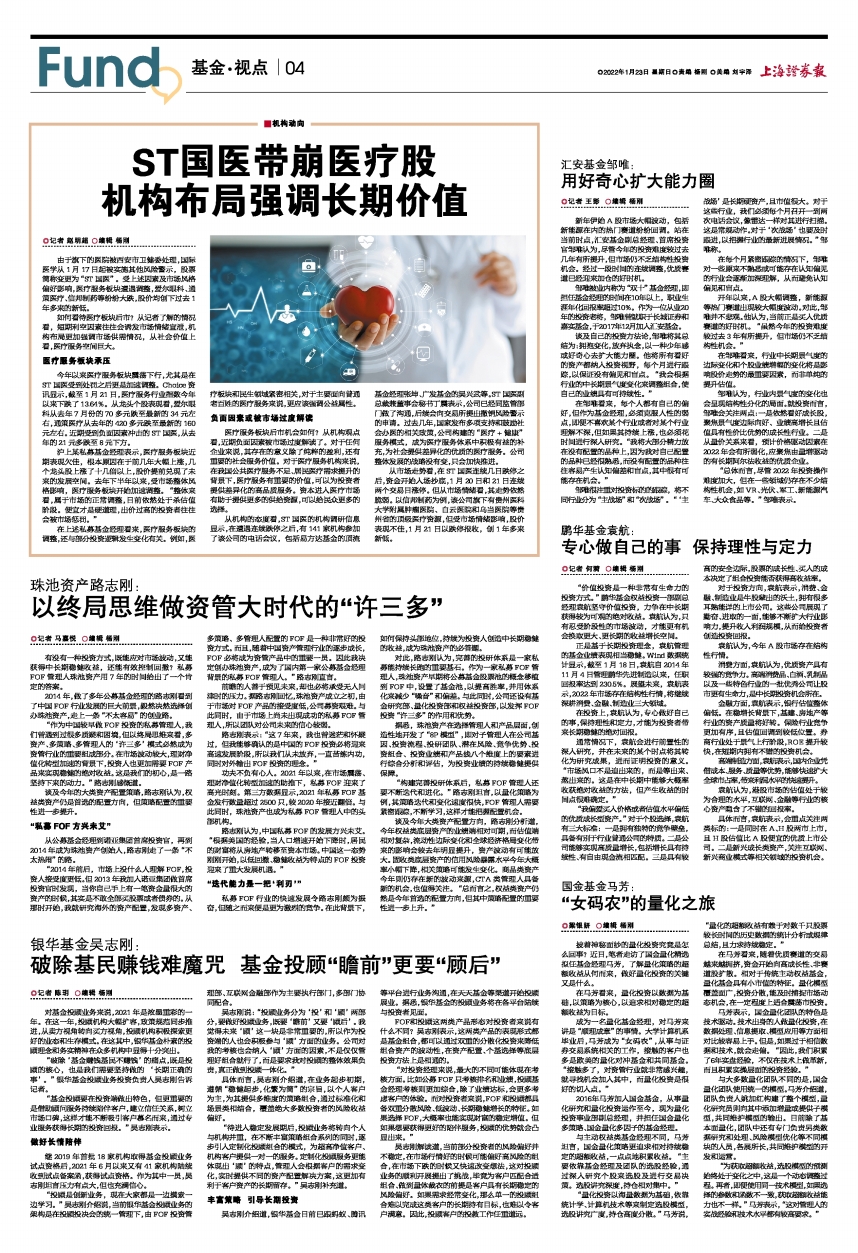 与主动权益类基金经理不同,马芳坦言,国金量化策略更追求相对持续稳定的超额收益,一点点地积累收益。“主要依靠基金经理及团队的选股经验,通过深入研究个股来选股及进行交易决策。选股讲究深度,持仓相对集中。”