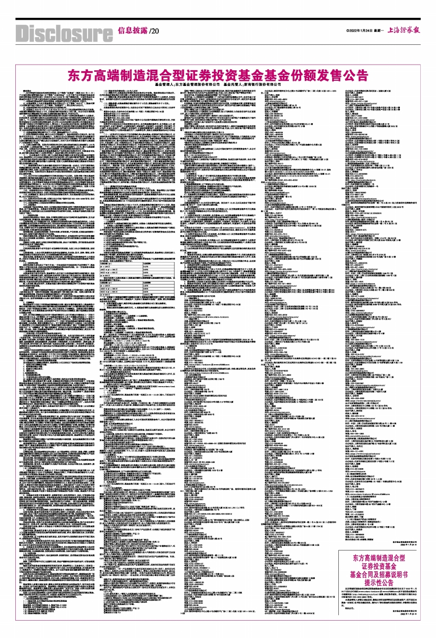 十三、本公告仅对本基金募集的有关事项和规定予以说明。投资者欲了解本基金的详细情况,请详细阅读披露在本公司网站及中国证监会基金电子披露网站上的《东方高端制造混合型证券投资基金招募说明书》、《东方高端制造混合型证券投资基金基金产品资料概要》、《东方高端制造混合型证券投资基金基金合同》、《东方高端制造混合型证券投资基金托管协议》。本公告及《东方高端制造混合型证券投资基金基金合同及招募说明书提示性公告》将于2022年1月24日同时刊登在《上海证券报》。投资人可通过本公司网站下载基金业务申请表格、了解本基金发售的相关事宜。