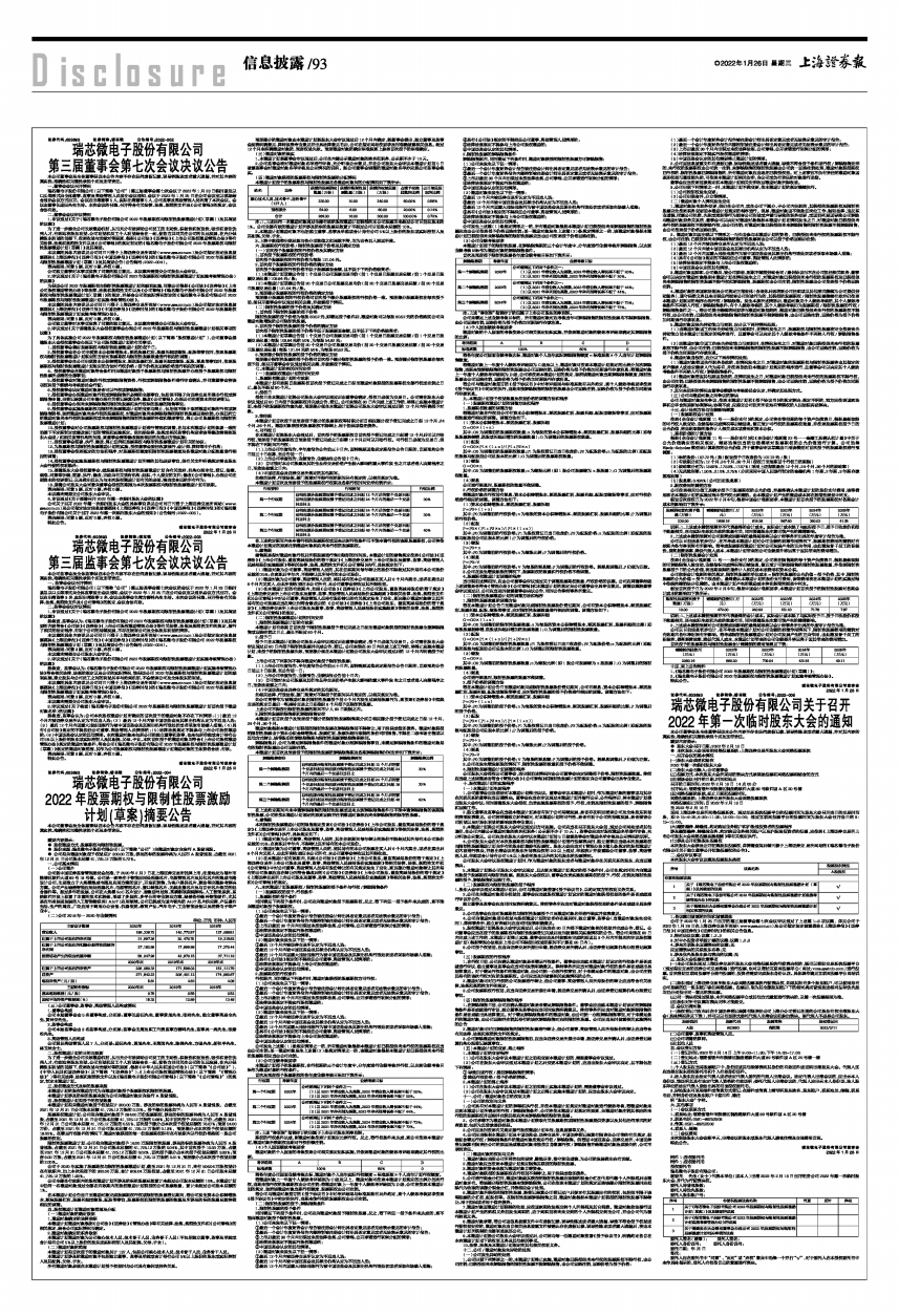 公司关于召开2022年第一次临时股东大会的具体事宜详见公司同日刊登于上海证券交易所网站(www.sse.com.cn)及公司指定法定信息披露媒体《上海证券报》《证券日报》《中国证券报》《证券时报》的《瑞芯微电子股份有限公司关于召开2022年第一次临时股东大会的通知》(公告编号:2022-005)。