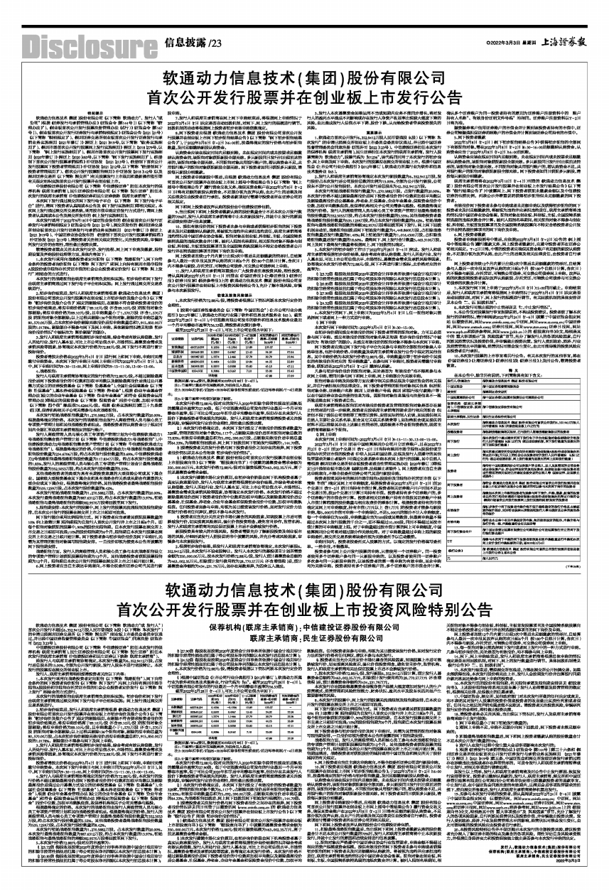 (3)提请投资者关注发行价格与网下投资者报价之间存在的差异,网下投资者报价情况详见同日刊登于巨潮资讯网(www.cninfo.com.cn)的《软通动力信息技术(集团)股份有限公司首次公开发行股票并在创业板上市发行公告》(以下简称“《发行公告》”)附表“初步询价报价情况”。