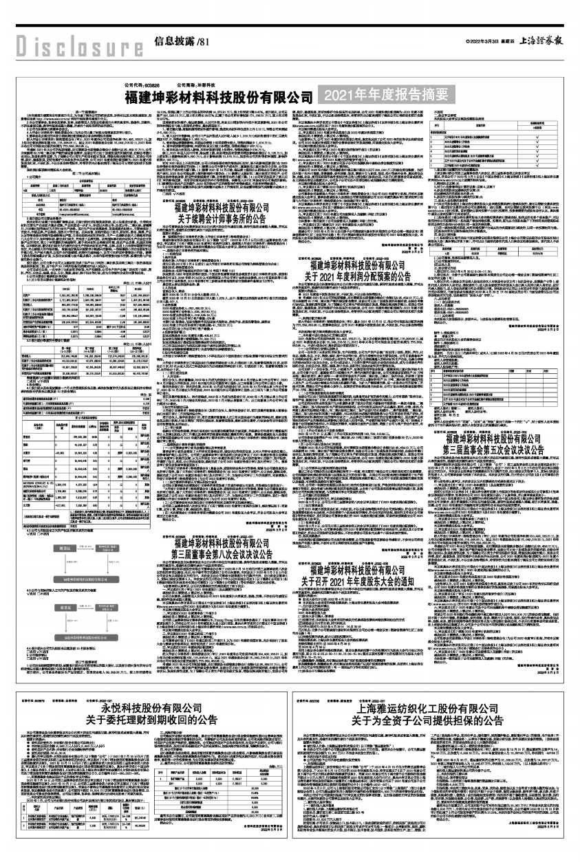 福建坤彩材料科技股份有限公司(以下简称“公司”)2022年3月2日召开第三届董事会第八次会议,审议通过了《关于续聘2022年度审计机构的议案》,拟续聘大华会计师事务所(特殊普通合伙)为公司2022年度审计机构,该事项尚需提交公司股东大会审议,现将有关事项公告如下: