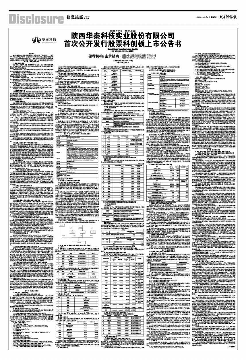 陕西华秦科技实业股份有限公司(以下简称“华秦科技”、“发行人”、“本公司”或“公司”)股票将于2022年3月7日在上海证券交易所科创板上市。本公司提醒投资者应充分了解股票市场风险及本公司披露的风险因素,在新股上市初期切忌盲目跟风“炒新”,应当审慎决策、理性投资。