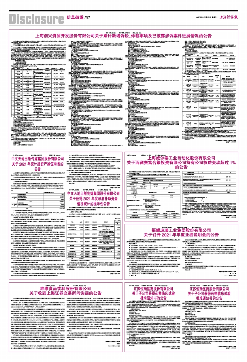上海创兴资源开发股份有限公司(以下简称“创兴资源”、“公司”)根据《上海证券交易所股票上市规则》有关规定,对公司及下属子公司继前次诉讼情况披露后至今的新增诉讼(仲裁)事项进行了统计,经梳理公司全资子公司上海筑闳建设工程有限公司(以下简称“筑闳建设”)、控股子公司上海东江建筑装饰工程有限公司(以下简称“东江装饰”)发生小额诉讼、仲裁案件共计21例,累计诉讼(仲裁)金额合计为3,009.16万元。其中,未决诉讼(仲裁)案件共计17例,涉案总金额为2,265.12万元;已决诉讼案件共计4例,累计涉案金额为744.04万元。公司涉诉主要原因为各类合同纠纷、票据追索权纠纷、劳动仲裁等。现将相关诉讼(仲裁)情况公告如下: