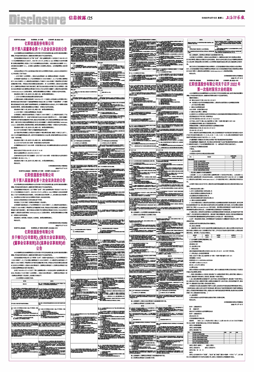 亿阳信通股份有限公司(以下称“公司”)第八届董事会第十八次会议于2022年3月14日以网络视频会议方式召开。2022年3月9日,公司以E-mail和微信方式向全体董事、监事及高级管理人员发出了召开本次董事会会议的通知。本次应参加会议董事10人,实际参加会议董事10人。公司第八届监事会3位监事出席会议,公司高级管理人员列席本次会议。