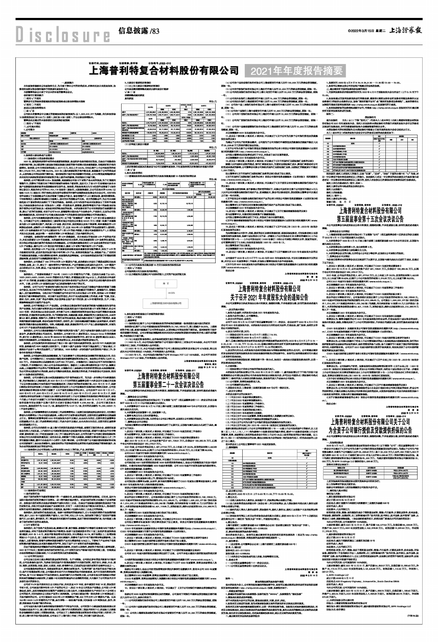 1、上海普利特复合材料股份有限公司(下文简称“公司”)第五届董事会第二十一次会议的会议通知于2022年3月11日以书面及通讯方式发出。