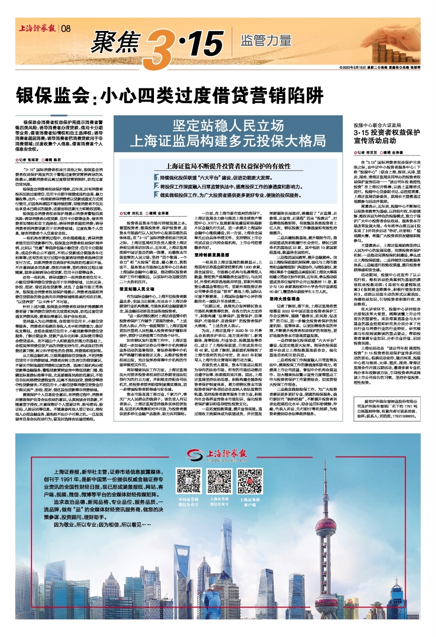 投资者是资本市场可持续发展之本。尊重投资者、敬畏投资者、保护投资者,是资本市场践行以人民为中心发展思想的具体体现。在“3·15”国际消费者权益日到来之际,上海证监局相关负责人接受上海证券报记者采访时表示,近年来,上海证监局按照中国证监会的统一部署,站稳资本市场监管的人民立场,坚持“四个敬畏、一个合力”和“大投保”理念,凝心聚力,真抓实干,服务资本市场深化改革中心任务和上海国际金融中心建设,推动辖区投资者保护工作行稳致远,以实际行动迎接党的二十大胜利召开。
