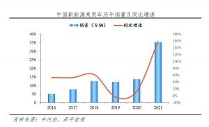 从历年销售量增速来看,过去我国新能源汽车增速变化基本与政策方向保持同步,政策驱动明显。根据中汽协数据,在政策鼓励私人购车后,在2014年和2015年我国新能源汽车销量分别同比增长320%和340%。此后,2016年、2017年和2018年,市场进入稳定发展期,销量增速同步放缓,分别同比增长53%、53%、62%。随后政策开始调整,财政补贴大幅退坡,在2019和2020年新能源汽车的销量增长同比分别为-4%和13%,销量增速大幅减少并首次出现负增长。