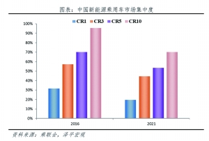 2016年,中国新能源汽车市场集中度指标CR1、CR3、CR5、CR10分别为31.6%、57.3%、70.1%和95.6%,到2021年分别降至19.5%、44.5%、53.4%和70.1%,市场的集中度出现明显下降,众多新生品牌涌入市场抢占市场份额。