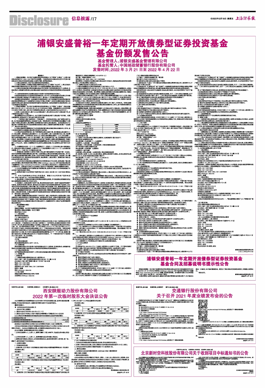 5、浦银安盛普裕一年定期开放债券型证券投资基金(以下简称“本基金”)基金份额将自2022年3月21日至2022年4月22日向社会公开发售。发售渠道为本公司的直销中心和电子直销(周六、周日电子直销照常办理业务,具体时间安排详见本公告正文)。