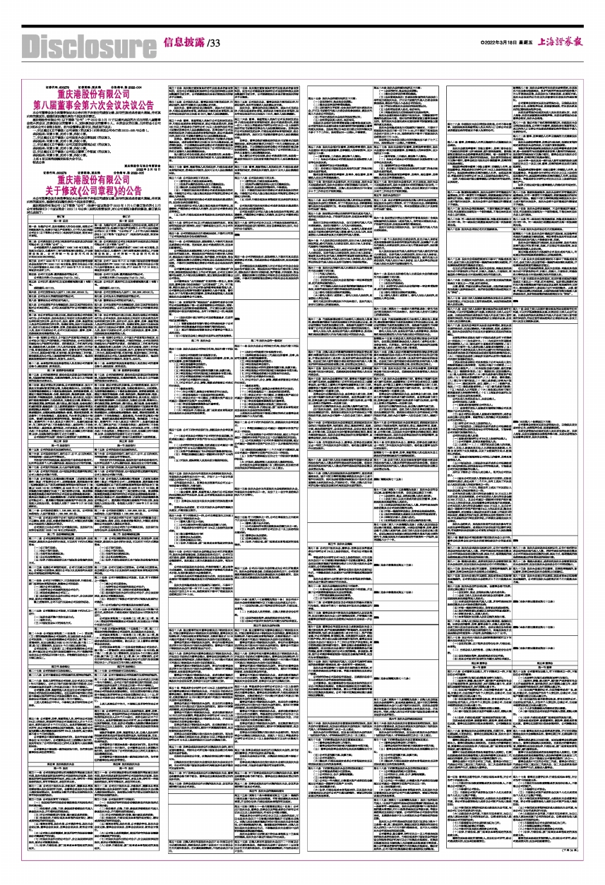 重庆港股份有限公司(以下简称“公司”)依据中国证监会于2022年1月5日修订发布的《上市公司章程指引》(中国证监会〔2022〕2号公告)及相关监管规定,对《公司章程》做相应修改,修订前后对比表如下: