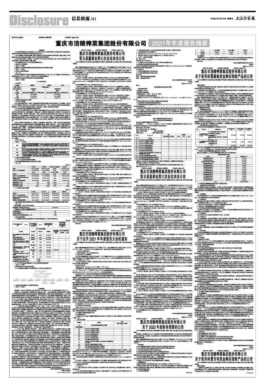 根据《公司法》和《公司章程》的规定,定于2022年4月18日(星期一)14:00在重庆市涪陵榨菜集团股份有限公司九楼会议室召开公司2021年年度股东大会。具体内容详见同日刊登于《中国证券报》《上海证券报》《证券时报》《证券日报》及巨潮资讯网(http://www.cninfo.com.cn)上的《关于召开2021年年度股东大会的通知》(公告编号:2022-014)。