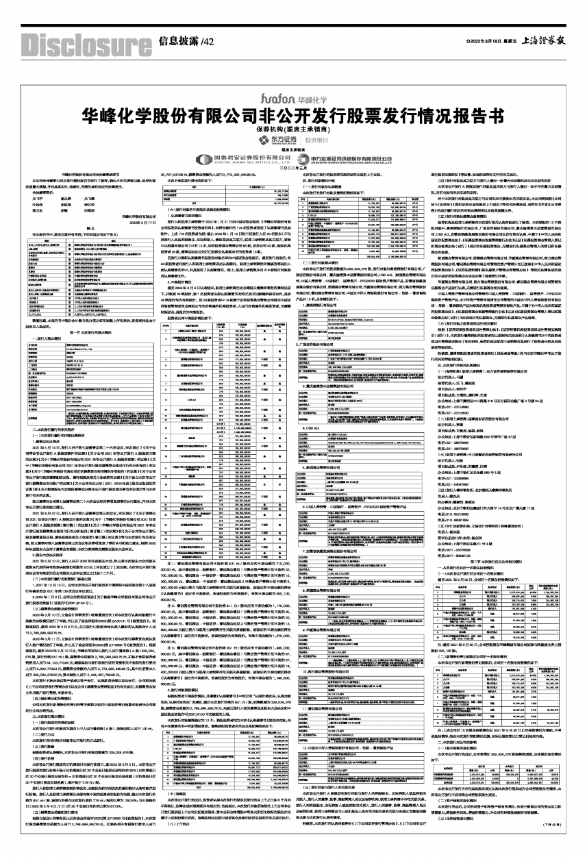 2、2022年1月6日,公司公告获得证监会《关于核准华峰化学股份有限公司非公开发行股票的批复》(证监许可[2021]4150号)。